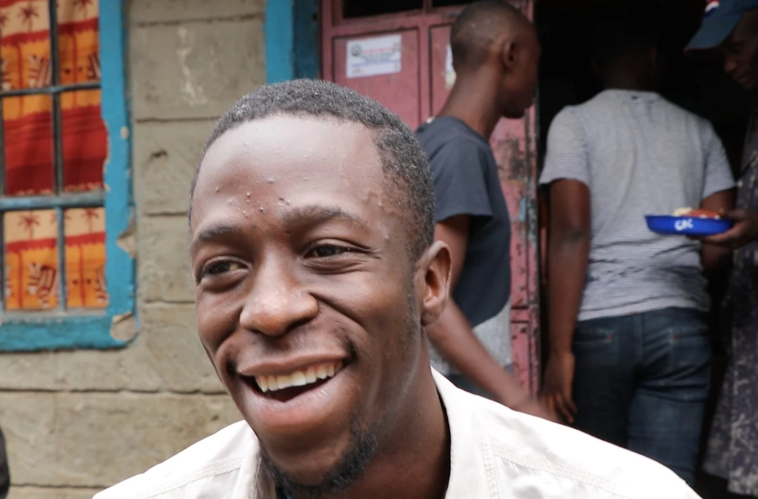 Sharply-dressed, he chats excitedly with a group of young men from different tribes about the change they hope to see come out of Kenya’s 2017 general election. The building behind them is covered in stickers bearing optimistic messages: “I am a peace ambassador,” one reads.