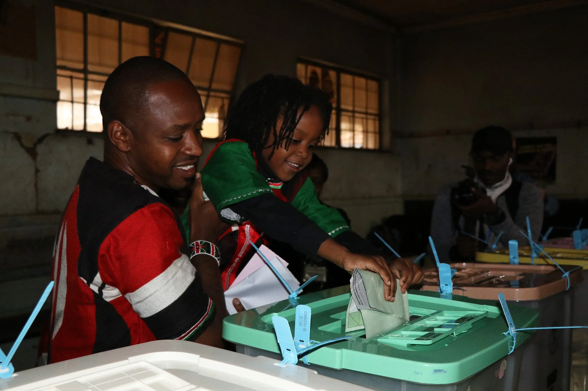 Boniface Mwangi, a 34-year-old journalist turned activist ran for Parliament. He cast his vote with his family at Juja Road Primary School in Nairobi, Kenya on August 8, 2017. (Neha Wadekar/GroundTruth)