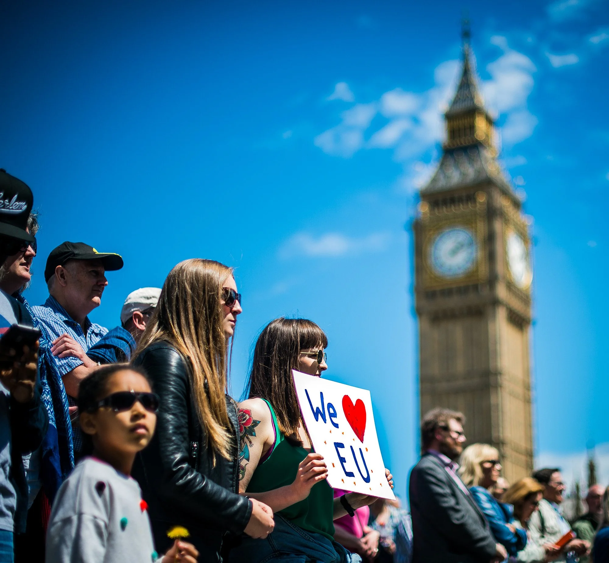 A young woman holds up a sign in favor of the European Union at the ‘March for Europe’ protest on July 2, London’s Big Ben visible in the sky above. (Photo by Garon S/Flickr User)