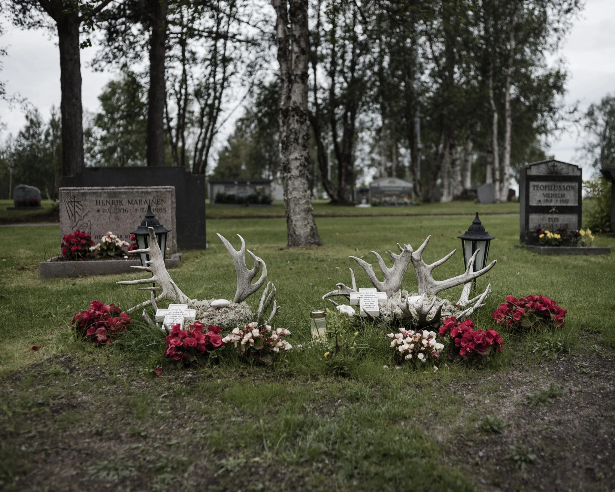 The graves of Gustu and Heaika Marainen are decorated with flowers and antlers. On the grave, there are words in Swedish: “It’s hard to see in young days fresh flowers fall – it’s hard to lose you, you were the joy for us all.” (Photo by Camilla Andersen/GroundTruth)