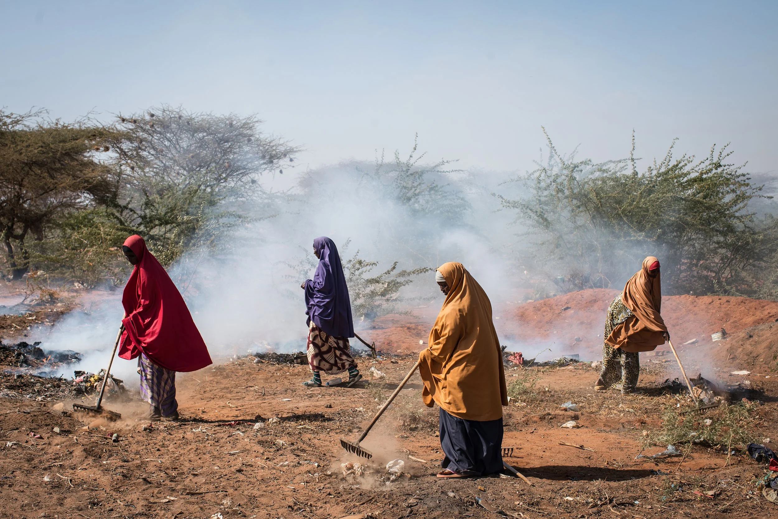 Somali women burn trash on the roadside in Dadaab refugee camp. (Nichole Sobecki/GroundTruth)