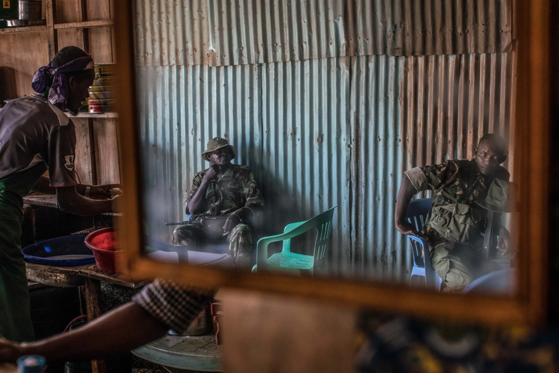 Armed police sit in a cafe in one of Dadaab’s many markets. Rights group have reported strong evidence showing that Kenyan police have carried out extrajudicial killings and enforced disappearances in Dadaab and elsewhere in the country. (Photo by Nichole Sobecki/GroundTruth)