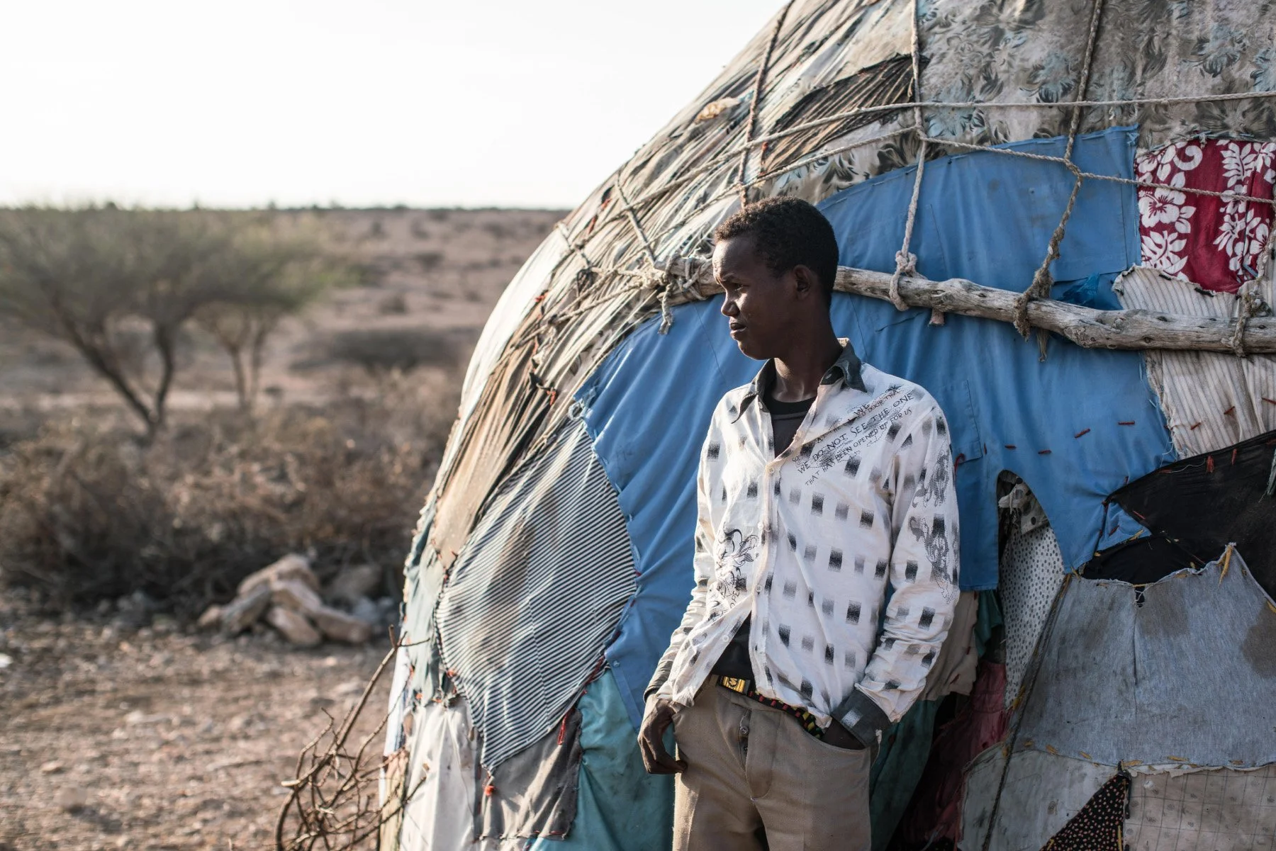 A boy stands outside his family’s home at dawn in Gebiley region, Somalia, amidst a severe drought that swept across northwestern Somalia. (Photo by Nichole Sobecki/GroundTruth)