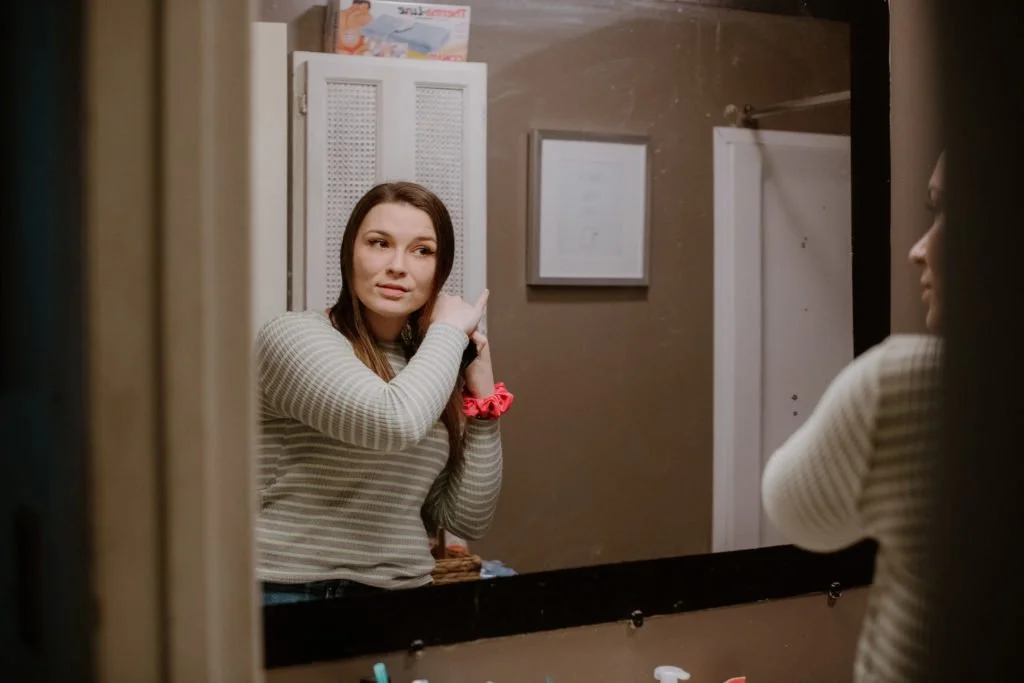 Danielle Gibson gets ready for work at a Morgantown gas station. She works almost full time in addition to her full time course load at West Virginia University. (Photo by Kristian Thacker)