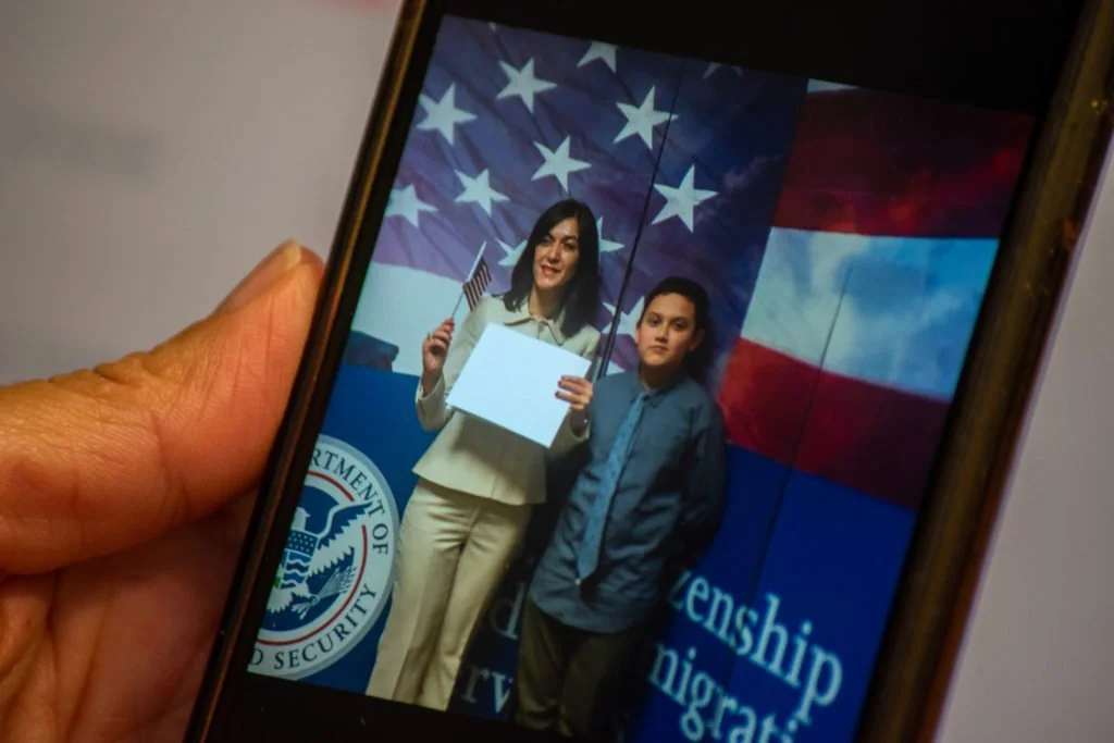 Alba Sánchez shows from her cellphone her favorite picture with her son at her naturalization ceremony March 21, 2019. (Photo by Laura Brache/GroundTruth)