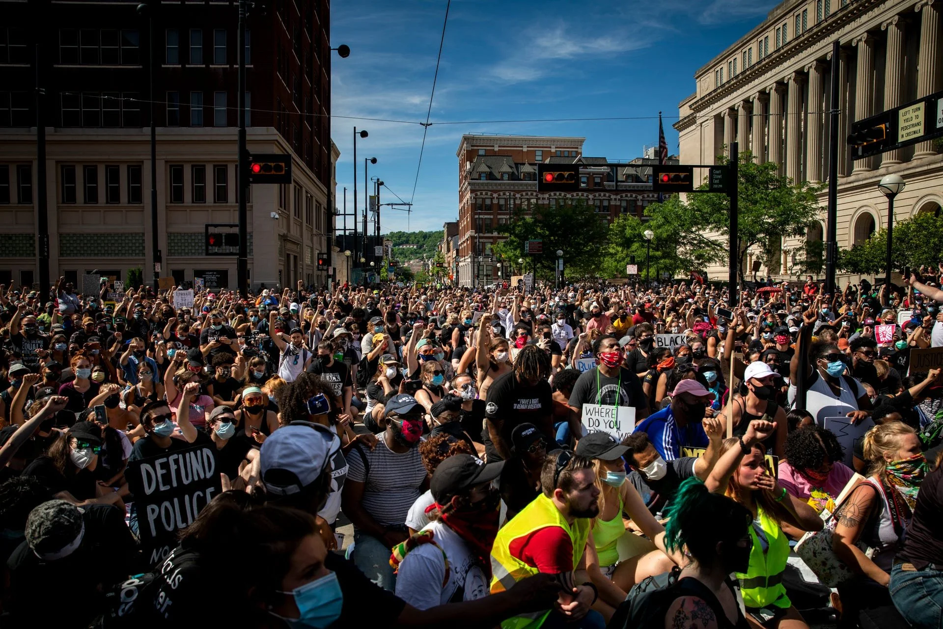 Just over the Ohio River from Northern Kentucky, thousands of protesters take a knee in front of the Hamilton County Courthouse in downtown Cincinnati on Sunday, June 7, 2020. (Photo by Meg Vogel/ The Enquirer)