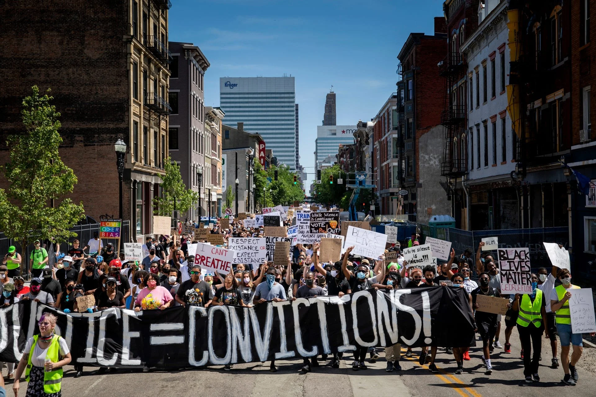 Thousands of protesters prepare to march on Vine Street in downtown Cincinnati on Sunday, June 7, 2020. Report for America corps member Julia Fair covers Northern Kentucky counties just across the river for the Cincinnati Enquirer. (Photo by Meg Vogel/ The Enquirer)