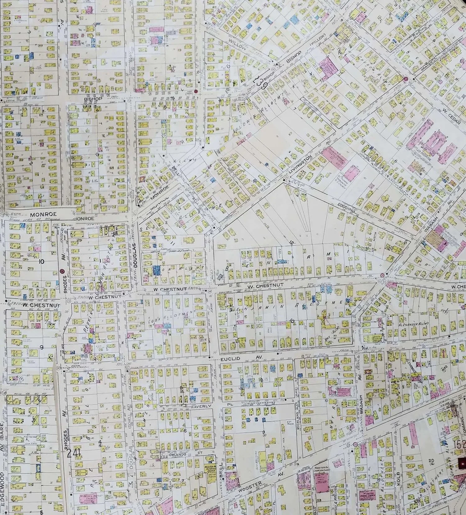 A Sanborn map from the 1930s shows some of the homes and businesses that were affected decades later by the Akron Innerbelt construction from West Cedar Street to the northeast to Wooster Avenue to the south. (Photo from Sanborn)