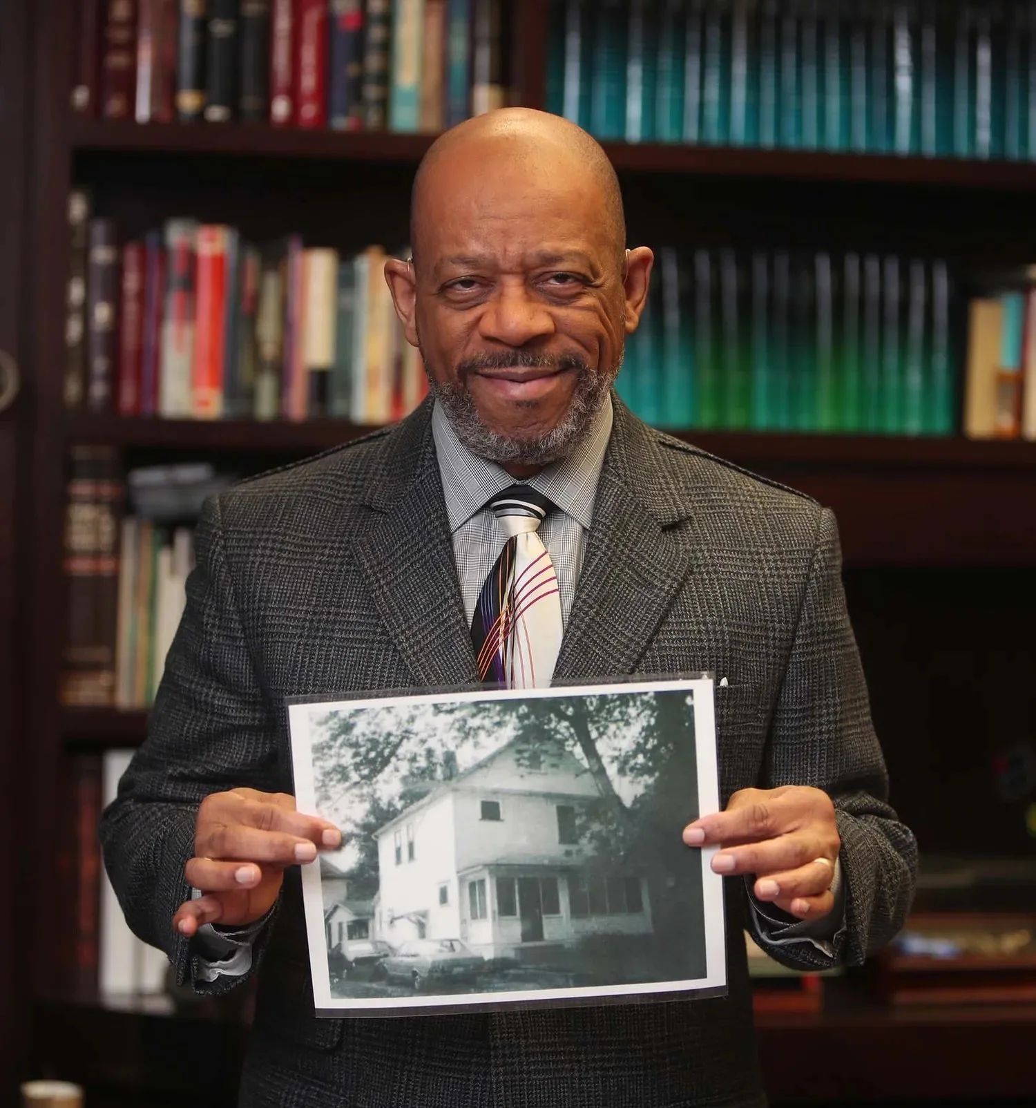 Bishop Joey Johnson, pastor of the House of the Lord, holds a photograph of his family’s home on Douglas Street that his father purchased in the late 1950s. The family blames the Akron Innerbelt construction for the home’s depreciation. (Photo by Karen Schiely/Akron Beacon Journal)