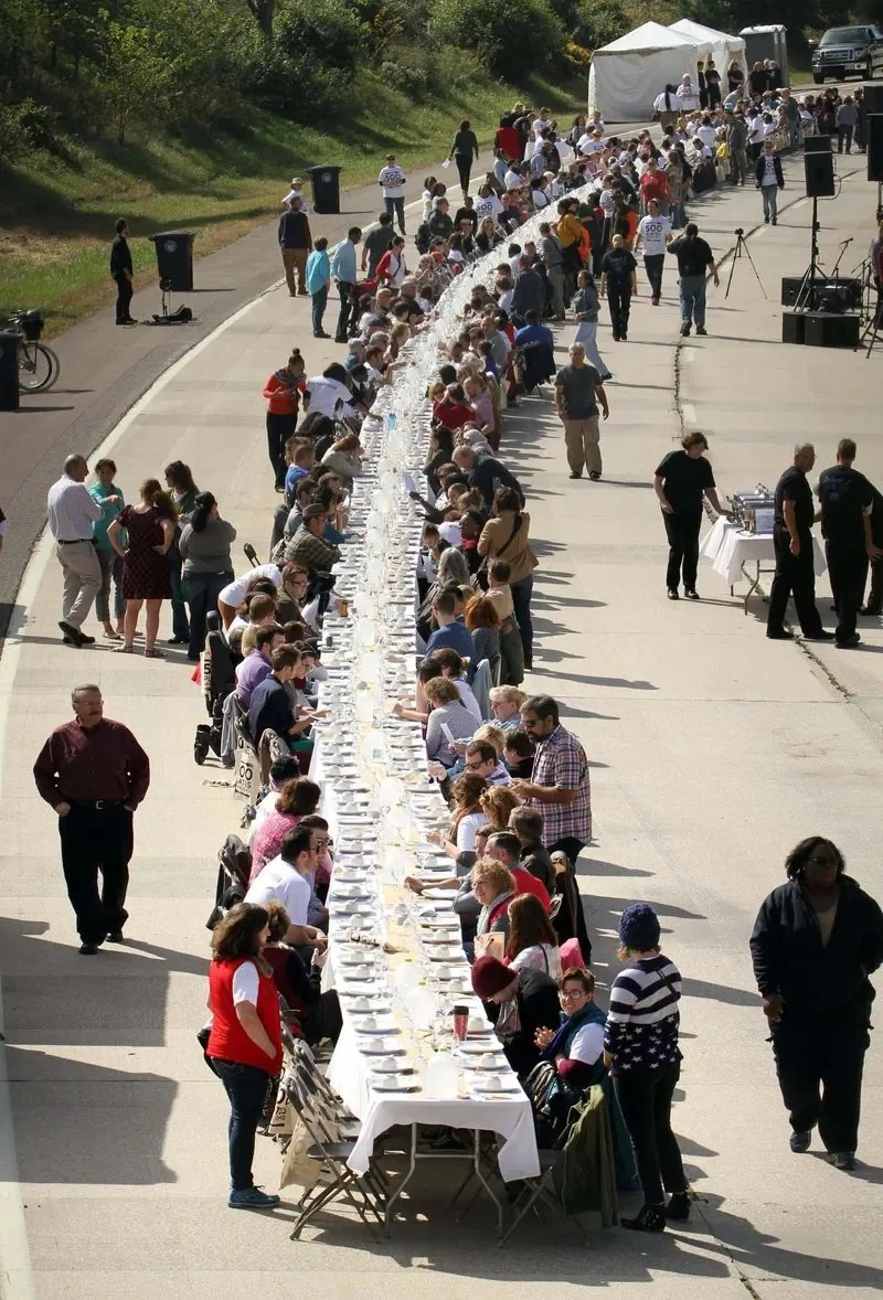 Diners gather around a 500-foot table on a stretch of the Akron Innerbelt during 500 Plates, a shared community meal, on Oct. 4, 2015. (Photo by Karen Schiely/Akron Beacon Journal)