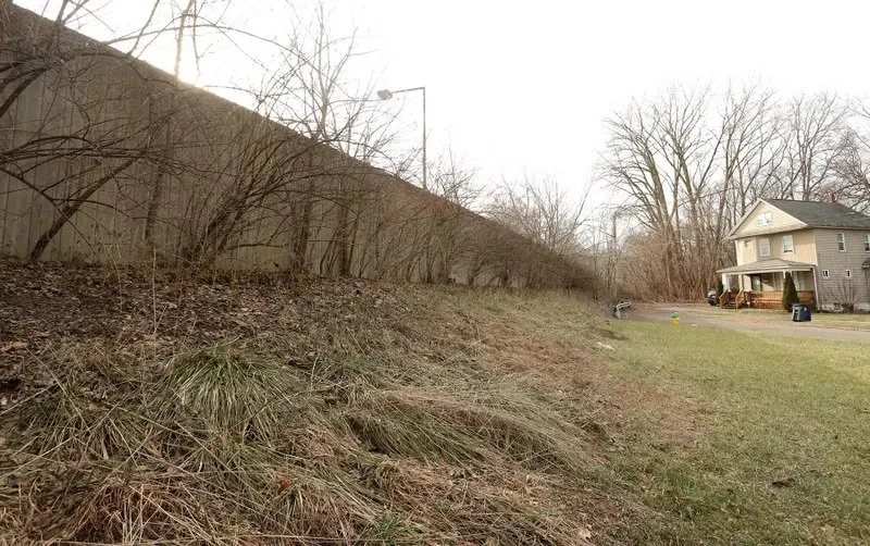 A wall separates the Akron Innerbelt from what remains of Douglas Street.
