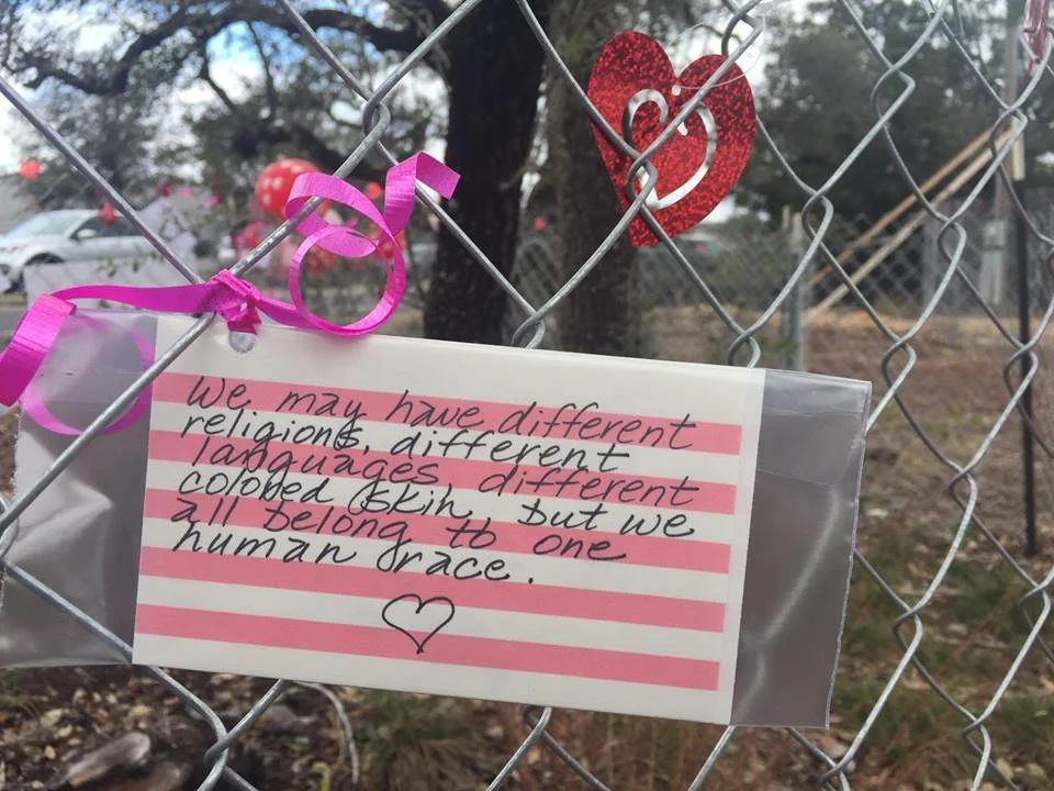 After the Islamic Center of Lake Travis, Texas, burned down on January 7, 2017, neighboring non-Muslims came to show their solidarity on Valentine's Day, posting hearts with messages of support at the former site of the mosque. (Anjum Hanafi/Facebook)