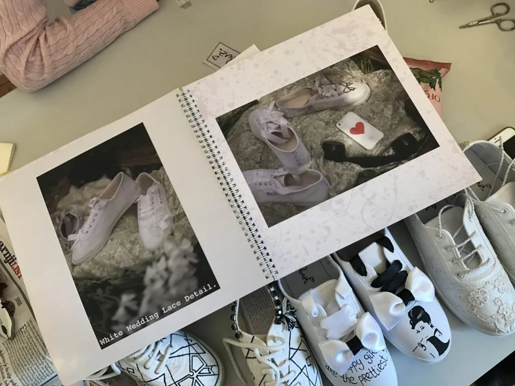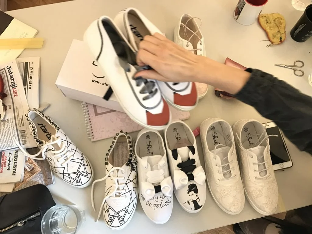 Maja Žirovčić rearranges the hand-painted shoes she’s designed with co-founder, Ljudmila Mihajlović. (Photo Credit: Karolina Chorvath)