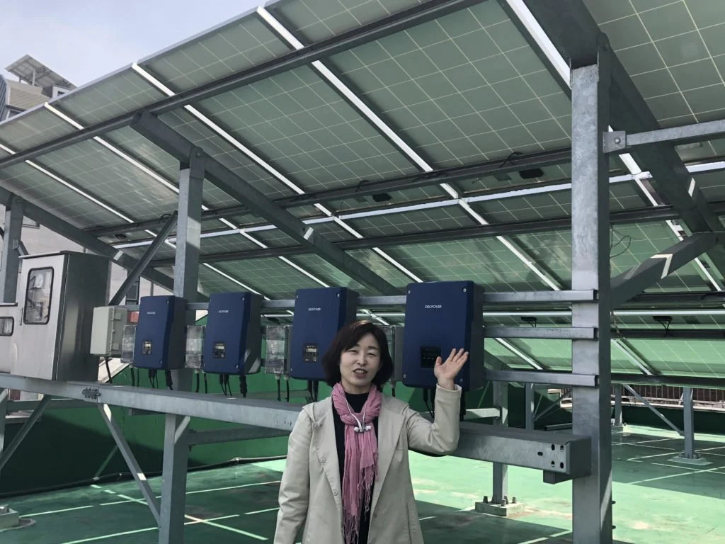 Eunsook Cho of Won Buddhist Eco Network stands in front of the solar panels on the roof of Song-cheon Won Buddhist temple in Seoul. (Sherry Simpson/GroundTruth)