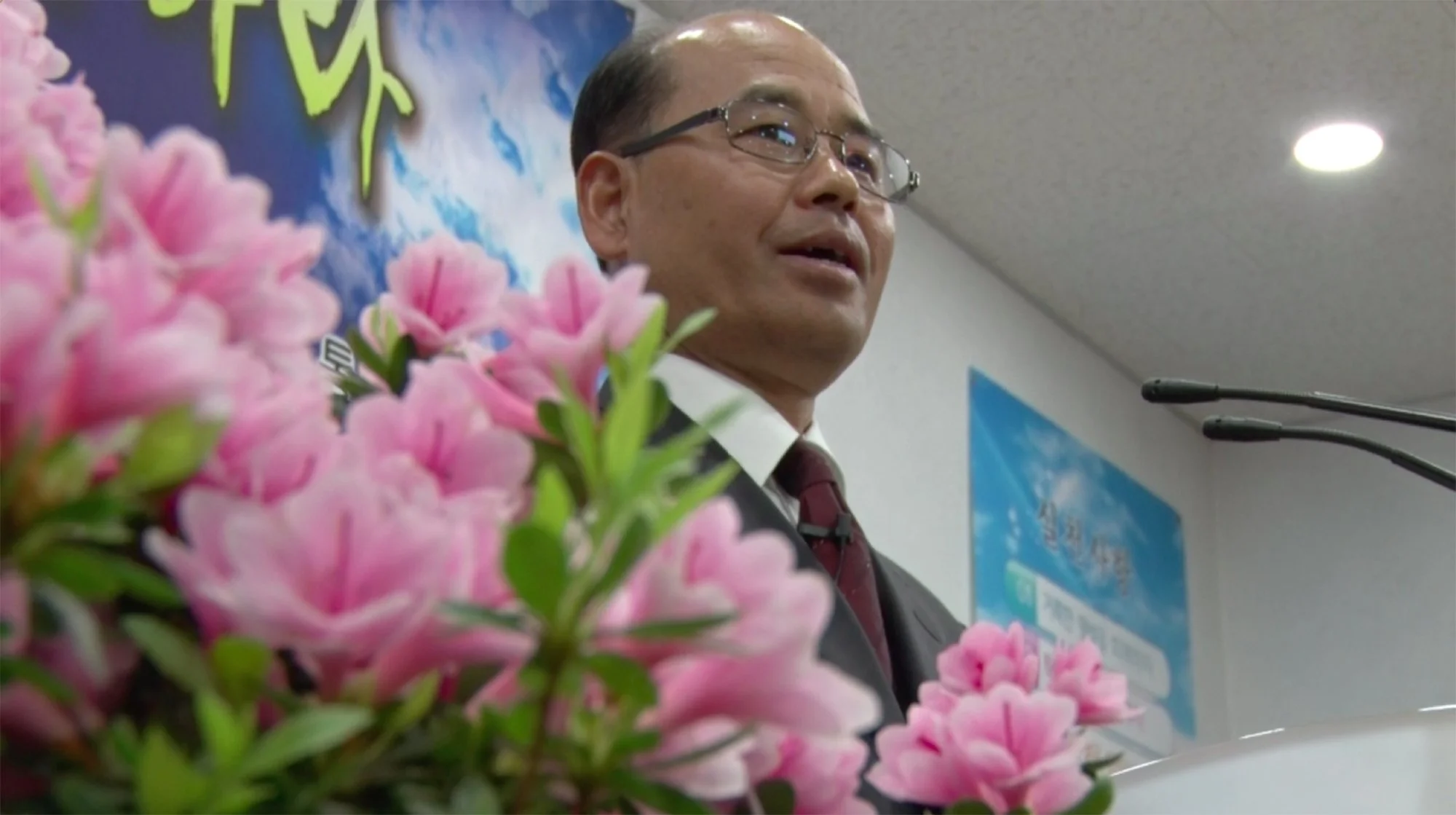 Pastor Gang Suk Jin prepares his sermon at Tongil Chon’s only church. (Aziza Kasumov/GroundTruth)