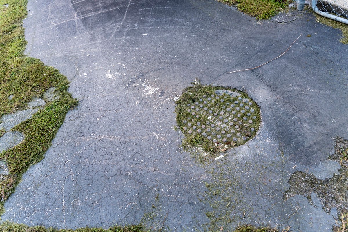 Toilet paper litters the ground Oct. 2, 2018, near a manhole cover in Chattaroy, Mingo County, W.Va., out of which residents say raw sewage flows any time the area receives significant rainfall. (CREDIT JESSE WRIGHT / WEST VIRGINIA PUBLIC BROADCASTING)