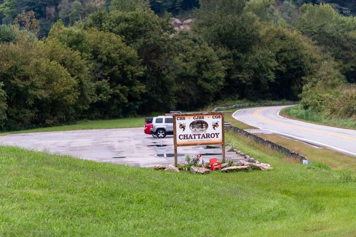 A sign greets visitors to Chattaroy, Oct. 2, 2018, in Mingo County, W.Va. (CREDIT JESSE WRIGHT / WEST VIRGINIA PUBLIC BROADCASTING)