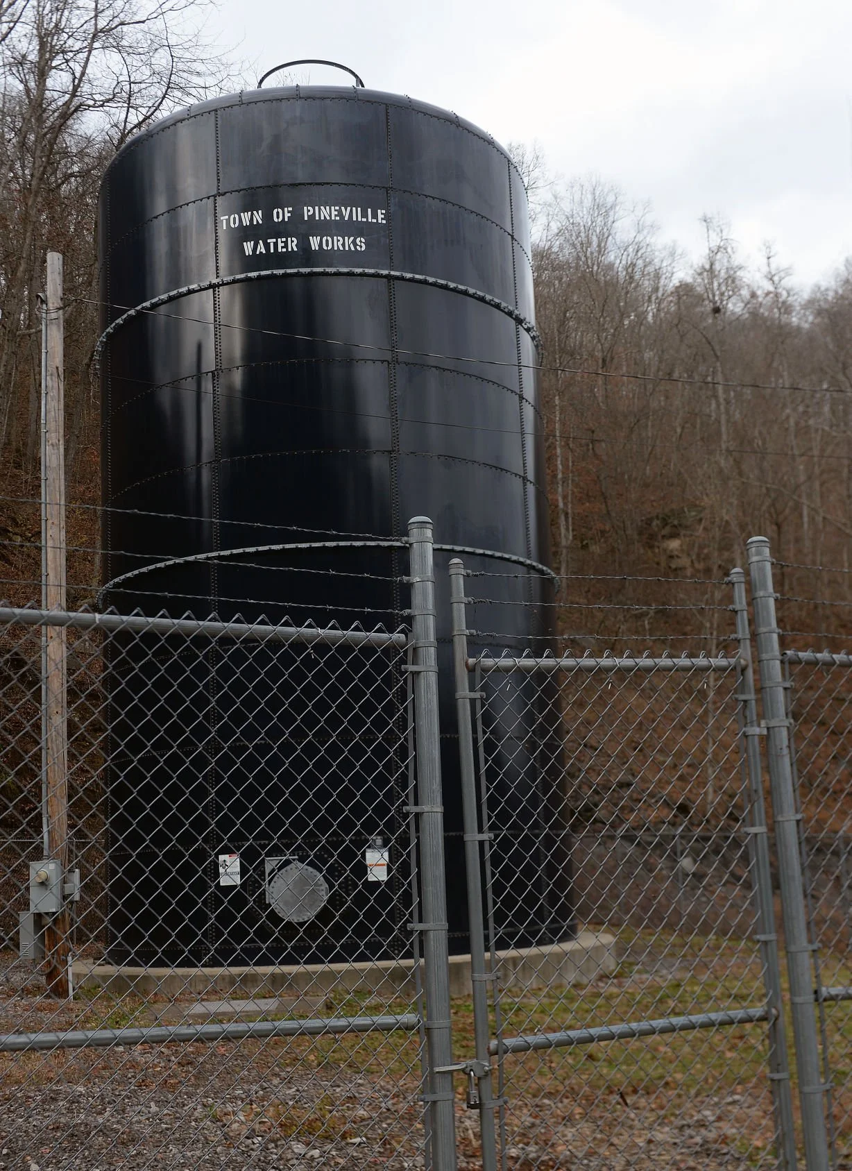 A water tank for the town of Pineville sits off U.S. 52 in Wyoming County. Earlier this year, a group of Pineville residents filed a class action lawsuit against the system, claiming the water it provides to residents is unsafe and can make people sick.
