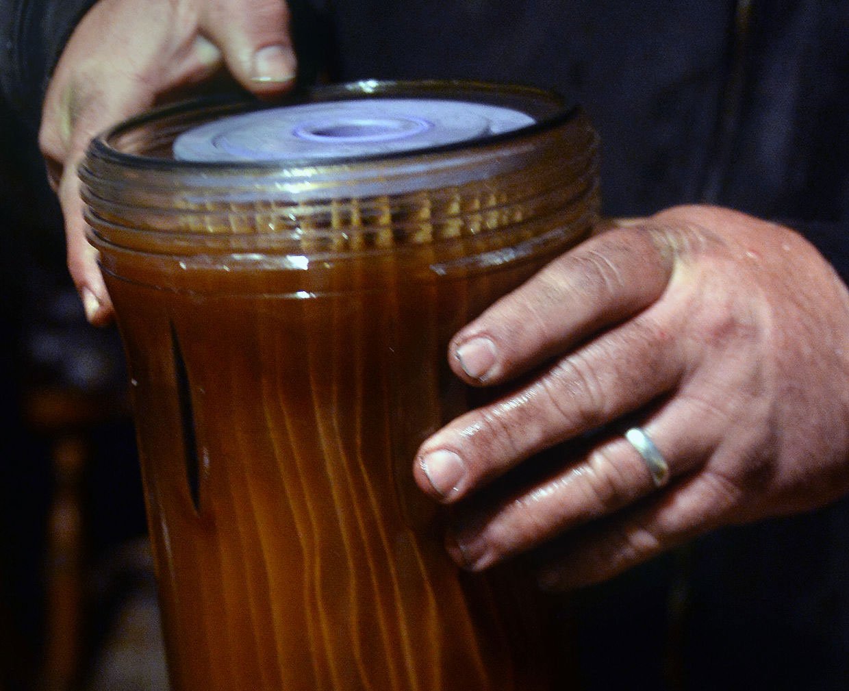 Chris Coleman, of Gary, holds a water filter he just removed from his family’s water system. The reddish-brown, muddy water is what flows into their pipes before it hits the filter, he said. (Photo by F. Brian Ferguson | Gazette-Mail)