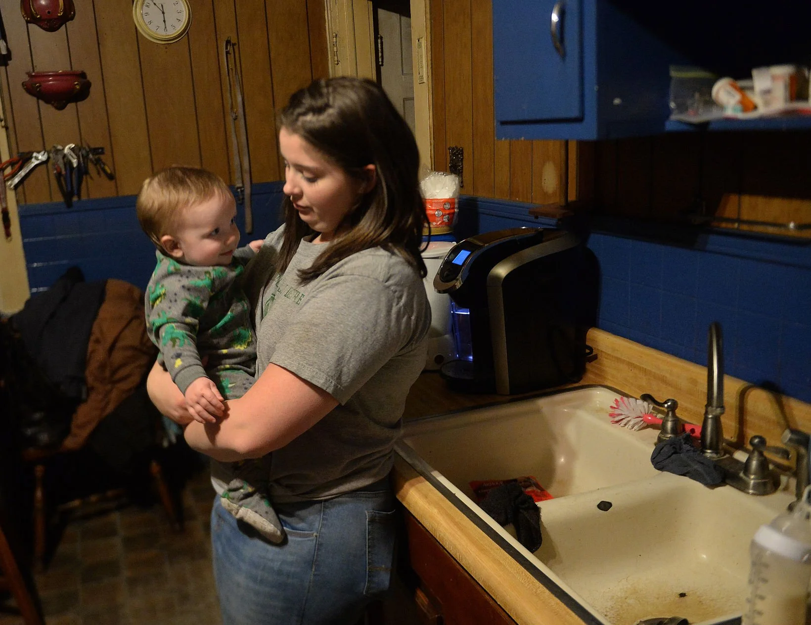 Cierra Coleman holds her 9-month-old son, Keaton, in her mother’s Gary home. Cierra Coleman and her mother, Tina Coleman, are especially concerned with water quality now that Keaton is in the home. Each day, they avoid the water coming out of their bathtub, and instead use bottled water to bathe him. (Photo by F. Brian Ferguson | Gazette-Mail)