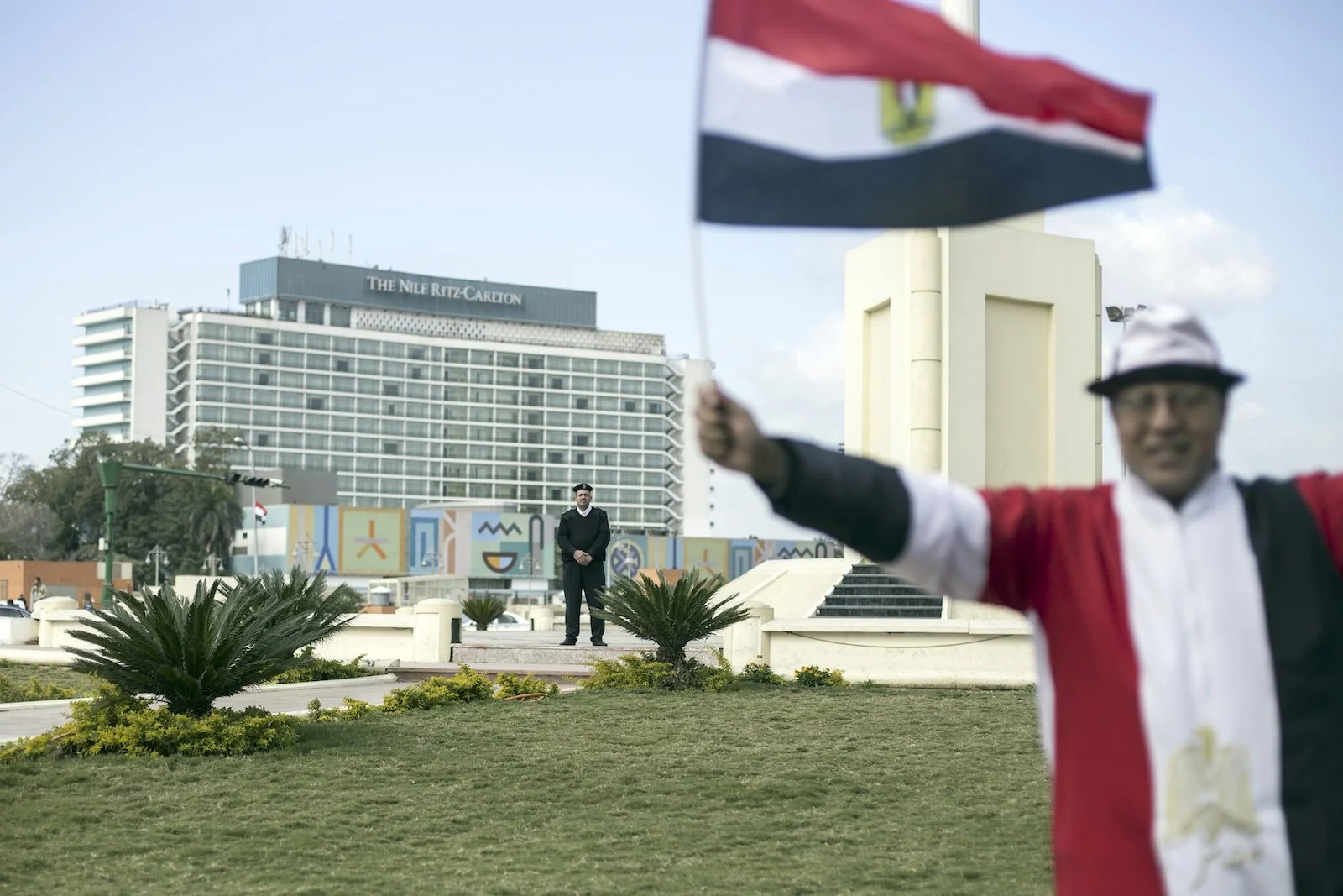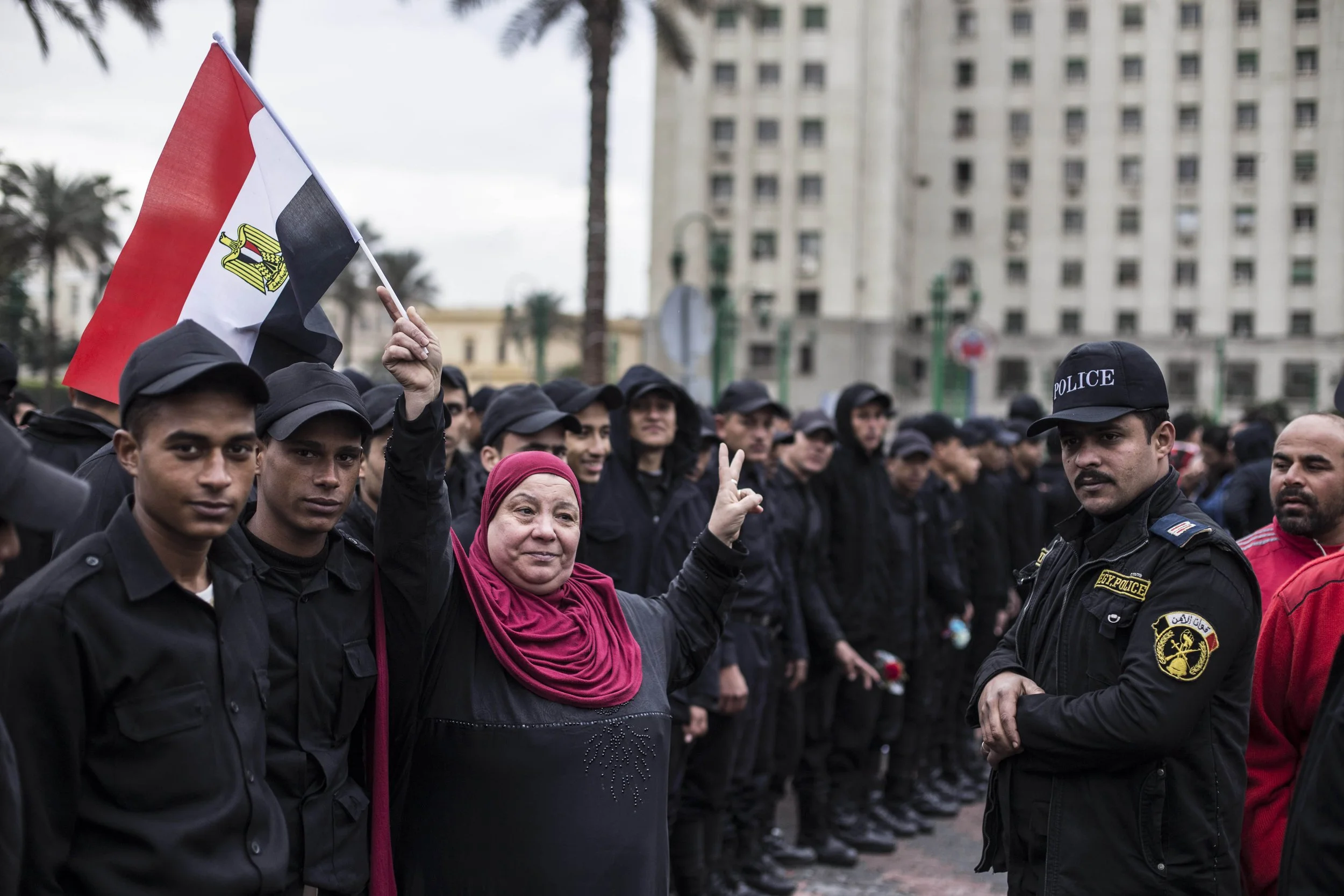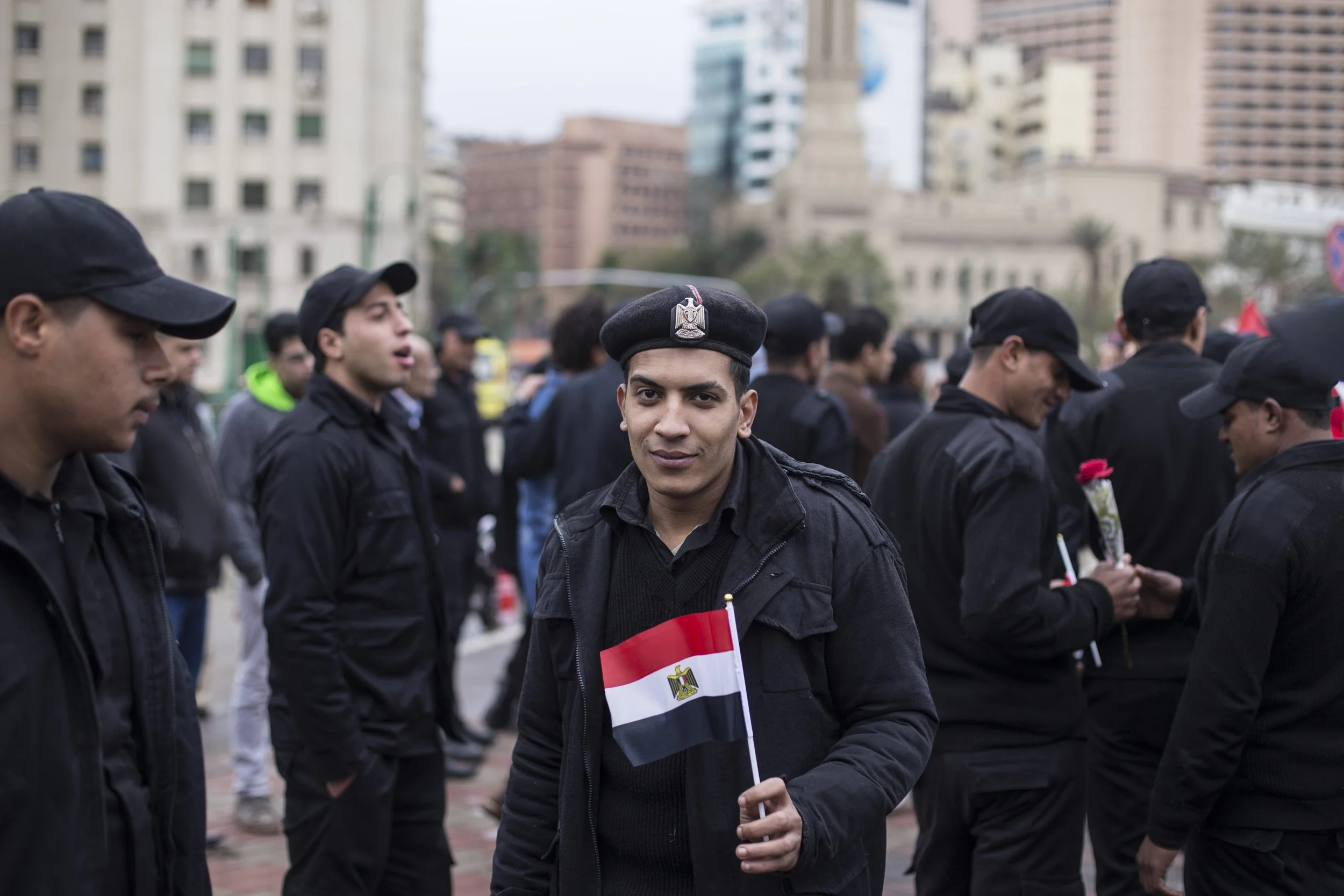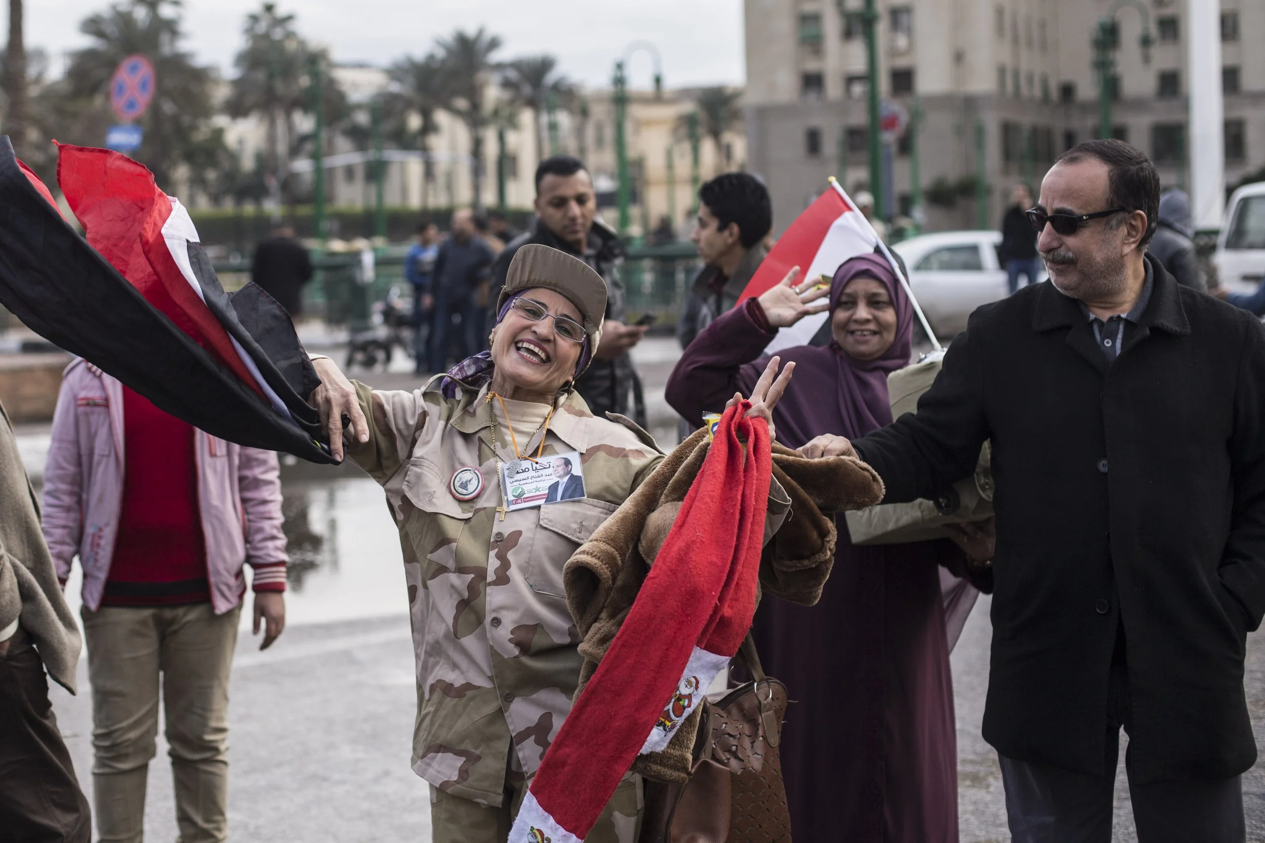Supporters of Sisi handed out flags in the square, including to this member of the police force.