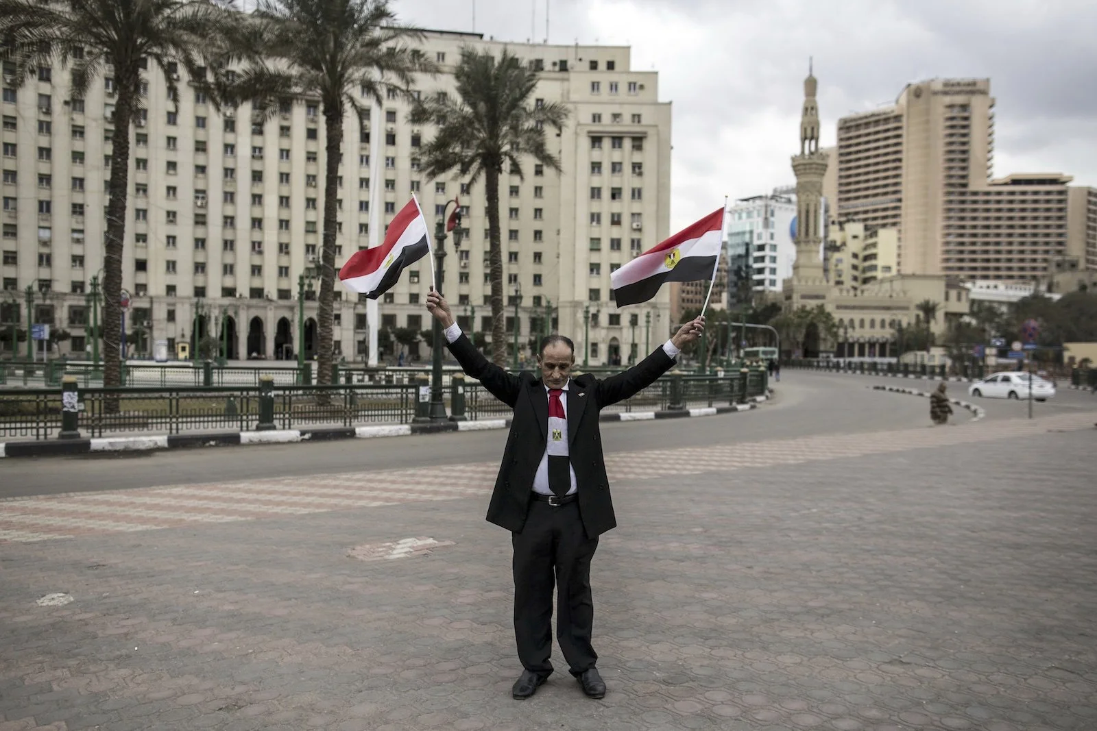 An Egyptian holds his country’s flags in Tahrir Square, marking the anniversary of the 2011 uprising that toppled longtime ruler Hosni Mubarak in Cairo, Egypt.