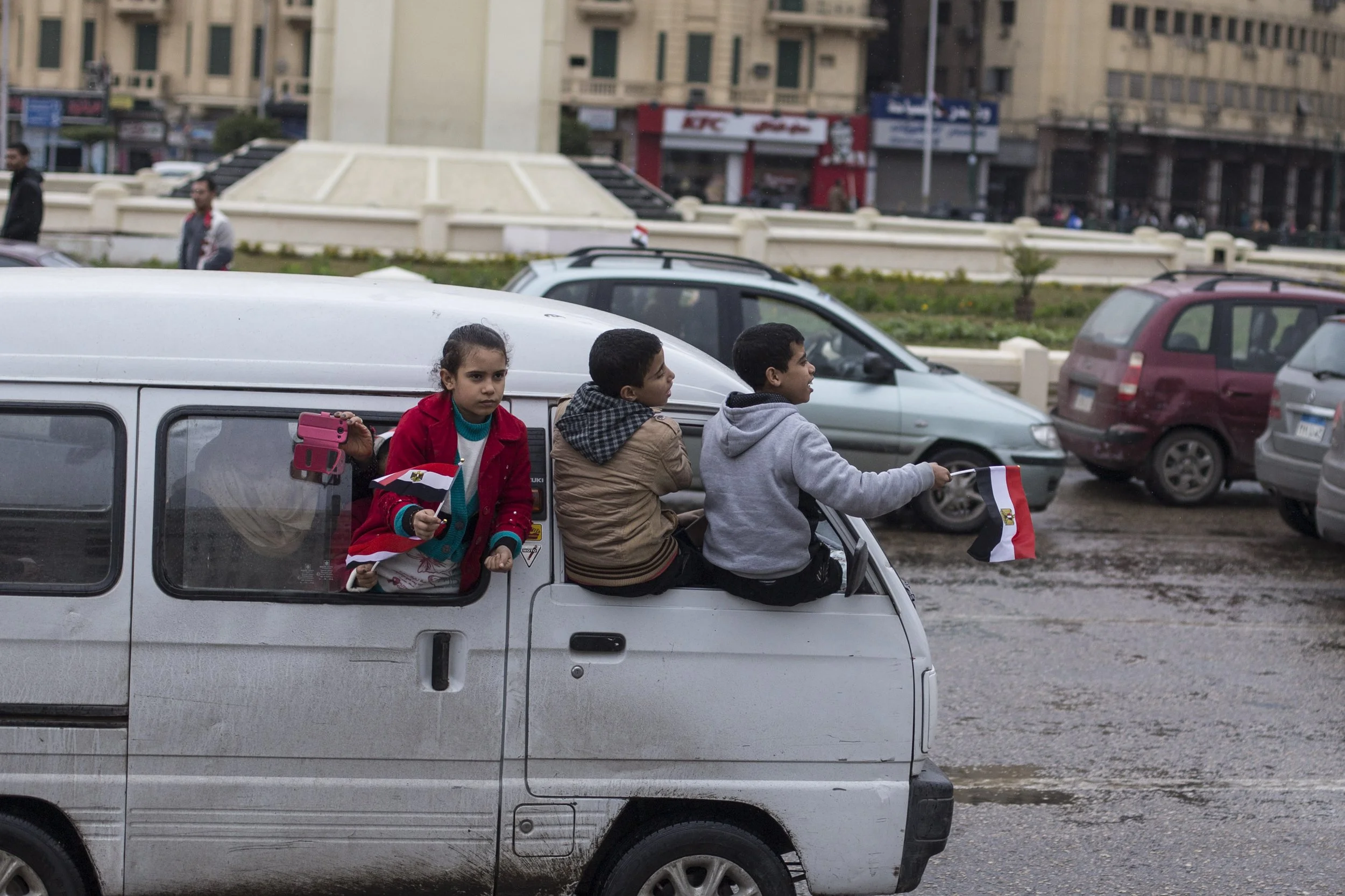 Children hold Egyptian flags while passing by Tahrir Square to celebrate the Police Day