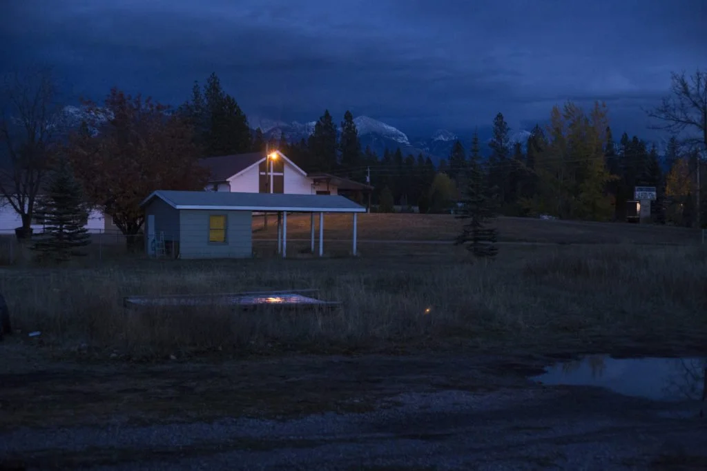 A church light shines as the sun falls behind the mountains of Pablo, Montana, on Sunday, October 22, 2017. (Photo by Brittany Greeson)