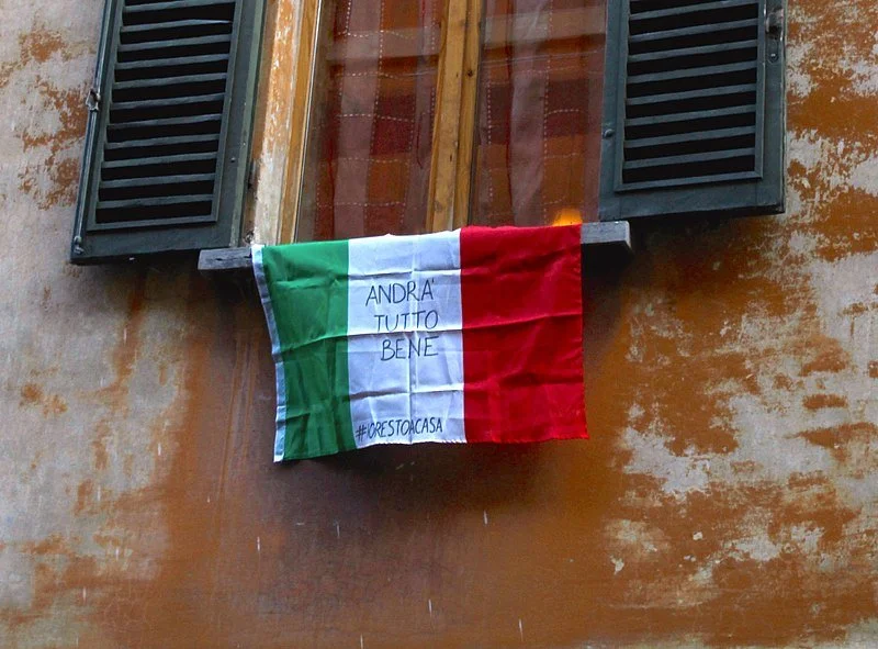 An Italian flag hung outside of a window in Bologna with the slogan “Andrà tutto bene” (or “Everything is gonna be fine” and #iorestoacasa means “#istayathome”) during the COVID-19 pandemic on March 19, 2020. (Photo by Pietro Luca Cassarino)