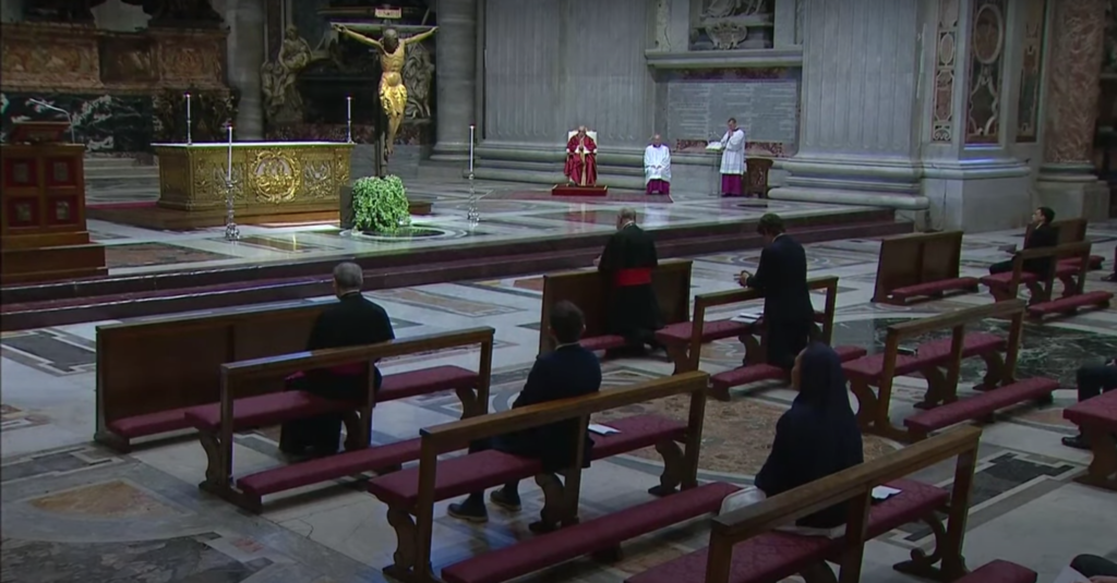 Pope Francis presided over the Good Friday celebrations in a nearly empty Peter’s Basilica on April 10, 2020. The Mass was live streamed through YouTube. (Screenshot by GroundTruth)