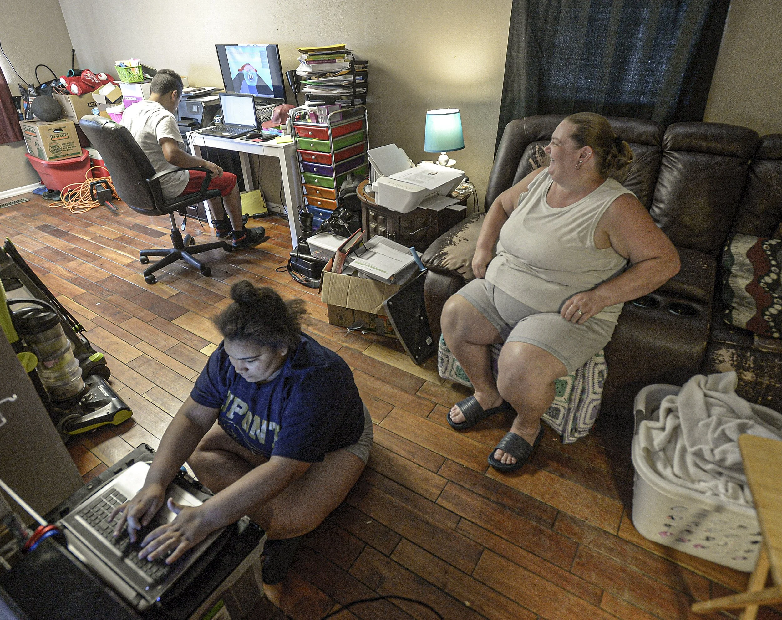 Angelica Smith, 14, left, plays a video game as her brother William Smith, 13, center, works on the family computer. Their mother, Jessica Smith, looks on in the family home on July 9, 2020 in Belle, W.Va. The family is not able to get to their designated summer feeding site because they do not own a vehicle. Photo by F. Brian Ferguson/Mountain State Spotlight)