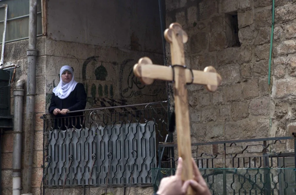 An Arab Muslim woman watches from a balcony as Christian pilgrims hold crosses on their way to the Church of the Holy Sepulcher, traditionally believed to be the site of the crucifixion and burial of Jesus Christ, during the Good Friday procession and the Way of the Cross, in Jerusalem’s Old City on Friday, April 22, 2011. (Photo by Heidi Levine/GroundTruth)