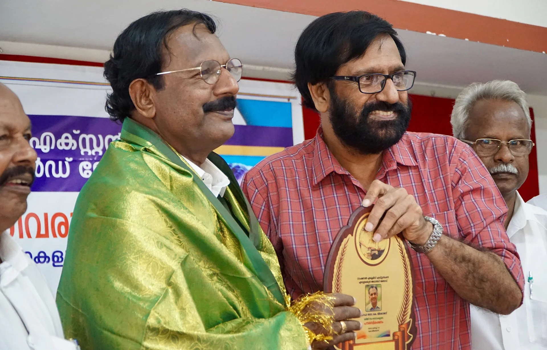 K.P. Ramanunni presents an award to K. Sivaraj, a Dalit education reformer. (Photo by Krishna Narayanamurti)