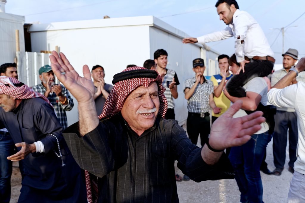 Friends and family celebrate the wedding of Syrian refugees Abu Ali, 24-years-old, (back right) and Bushra Hariri, 19-years-old, in Zataari refugee camp located 10 km east of Mafraq, Jordan. Shawn Baldwin/UNHCR