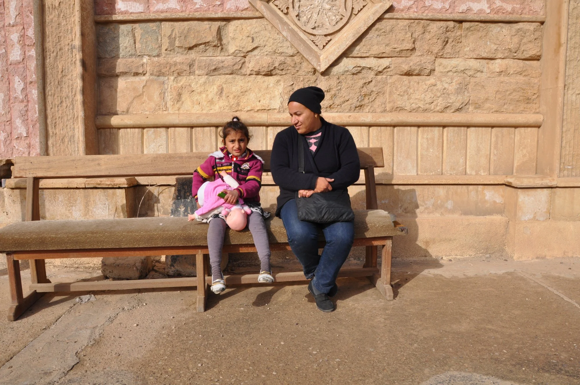 Saha and her daughter Mariam sit outside of their old church, now destroyed. (Photo by Lauren Bohn/GroundTruth)