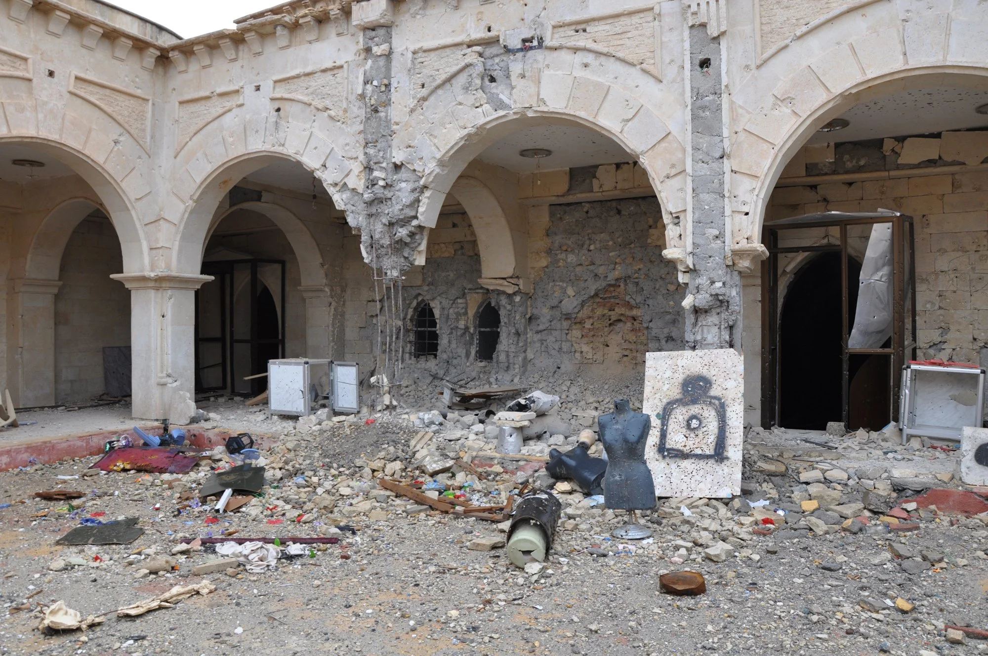The courtyard of Qaraqoosh's Al-Taheera church, the largest in Iraq and one of the biggest in the Middle East, was destroyed when ISIS transformed the grounds into a shooting range with mannequins from a nearby clothing shop. (Photo by Lauren Bohn/GroundTruth)