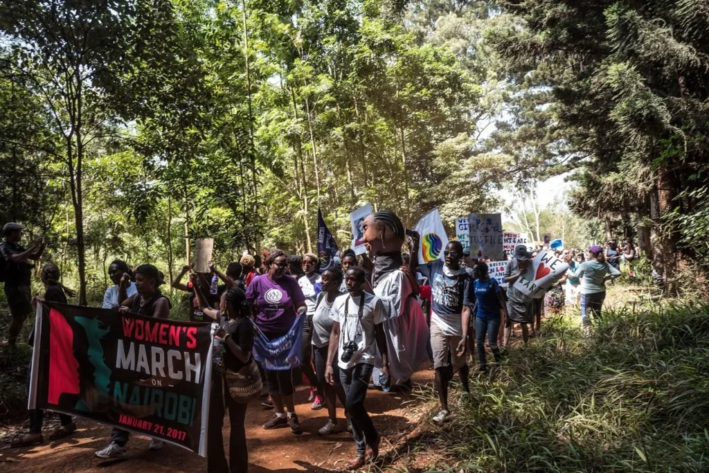 NAIROBI, Kenya — The dusty road leading into Karura Forest is busy with bikers, walkers and dogs on most Saturday mornings. But early today, a single protester stood out. “STOP Sexist Politicians,” read her sign.