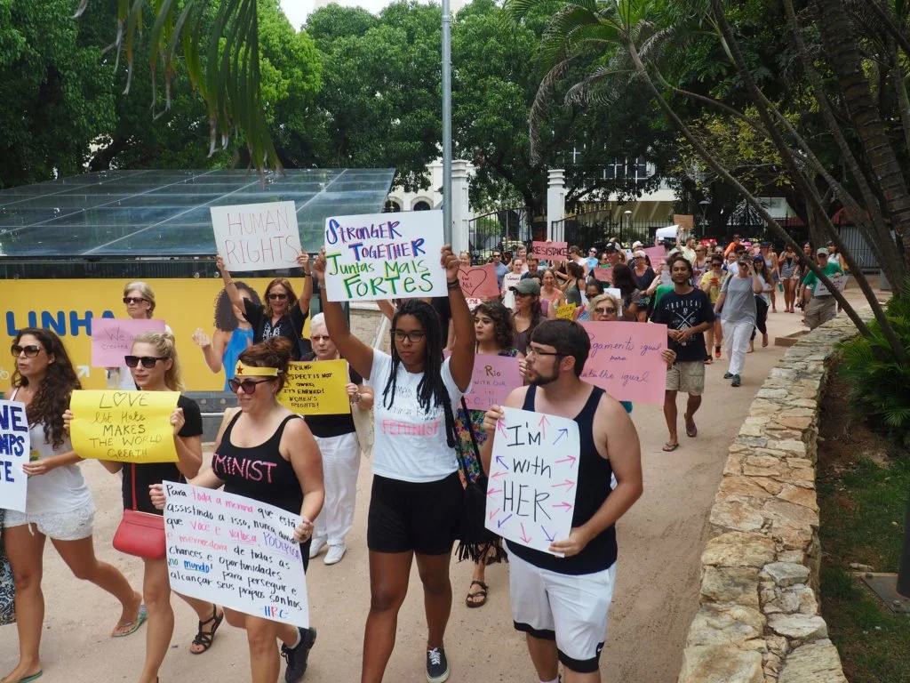 Rio’s protest was organized by Lee Weingast, a teacher and translator from New York who saw news of global “sister marches” online. Carrying a sign that said “Gender Justice = Racial Justice = Economic Ju$tice,” Weingast opened ceremonies encouraging protesters to “use this march as a jumping off point for real, very doable activism to come.”