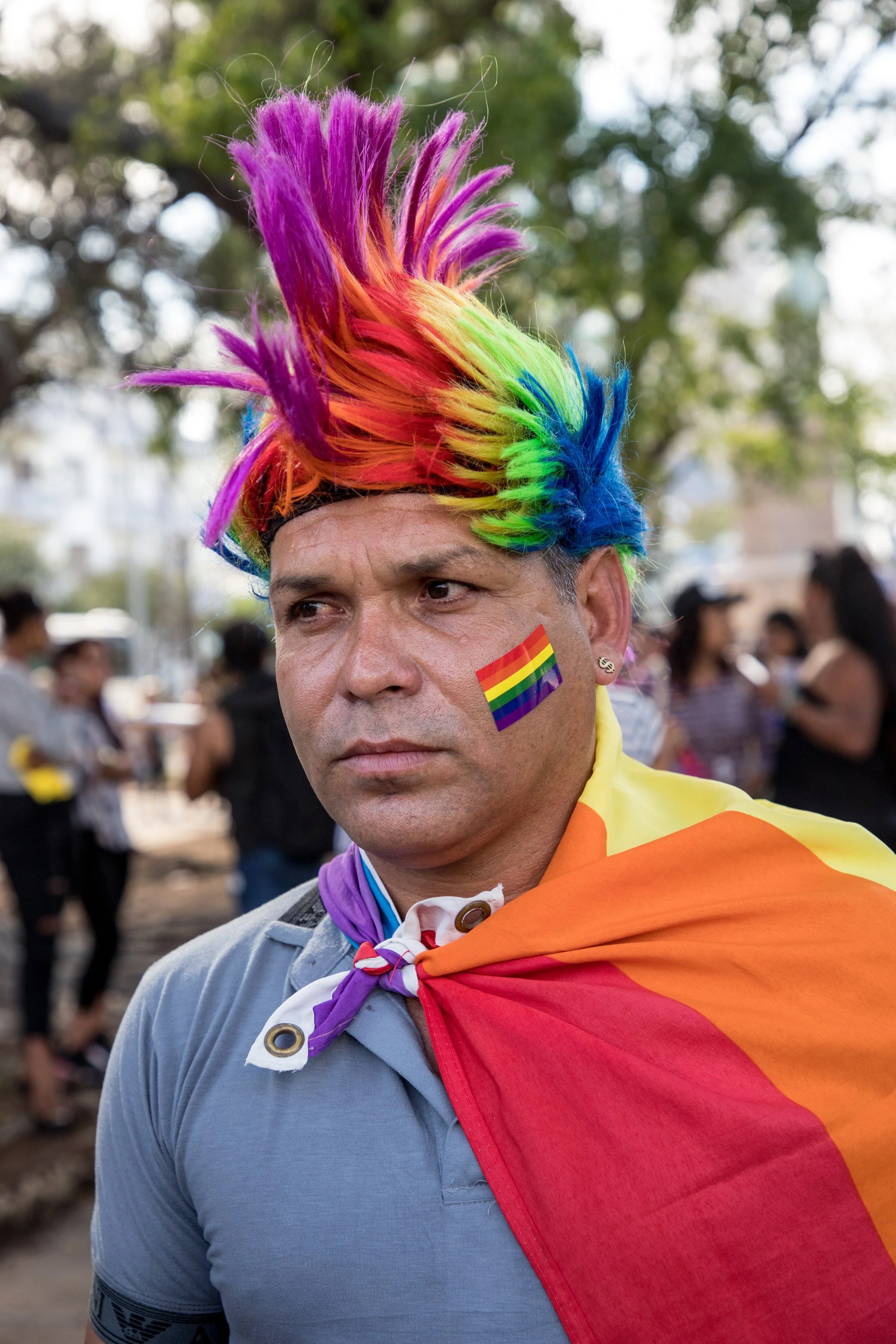 Amid all the celebration, Rafael Detiverce Benstei stands tall in a rainbow Mohawk, with a long rainbow flag around his shoulders.