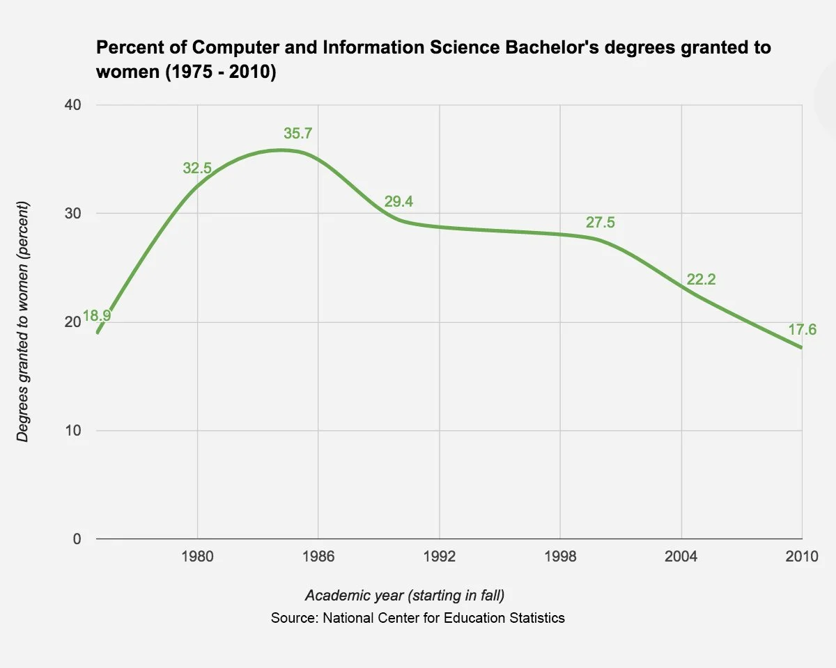 It might be a result of the drop off among women and girls as they get closer to entering the industry. According to Girls Who Code, a nonprofit that aims to close the gender gap in computer science, 66 percent of girls aged 6 to 12 show interest in computing programs. By the time they reach college, that number drops to just 4 percent.