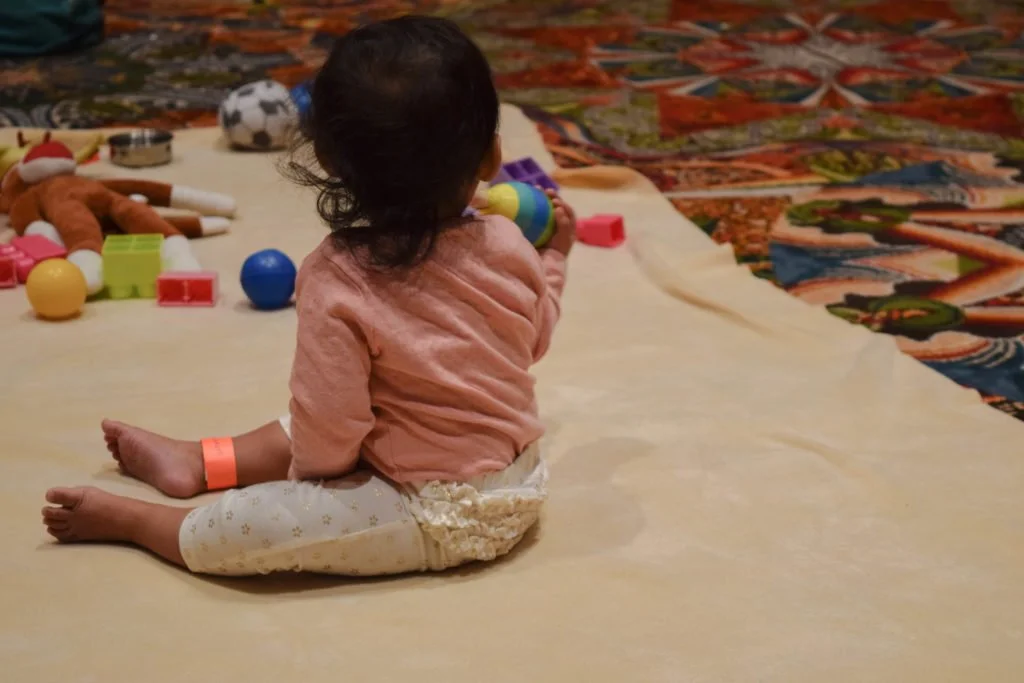 A young child plays under the supervision of childcare workers at the Grace Hopper Celebration of Women in Computing, a renown tech conference. (Photo by Alicia Miles/GroundTruth)